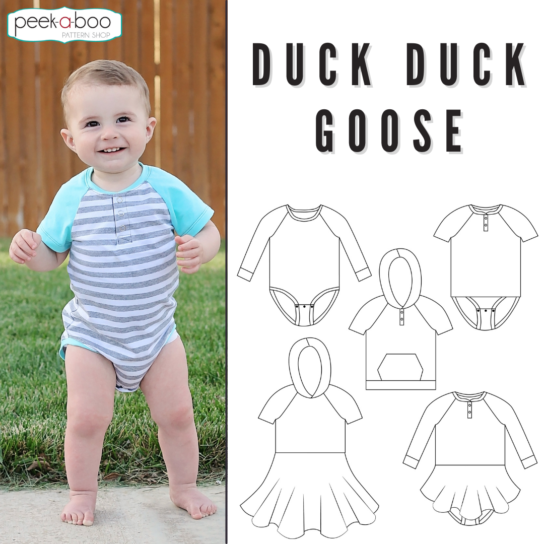 Sew a complete baby wardrobe with the versatile Duck Duck Goose pattern. With multiple views and options like short or long sleeves, neckband or hood, and an optional snap placket, this pattern offers endless possibilities for your little one's outfit.
