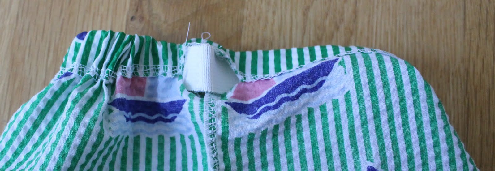 Basic Shorts Step 7: Cut your elastic to 1" shorter than your kid's waist measurement, slide it through the casing with a safety pin and then sew the ends together. Sew up the gap you left in the casing and you're all set!
