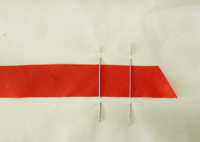 - Unfold the double-folded bias binding and place it along the wrong side of the raw edge. Line up the binding to the raw edges and secure with pins in place.