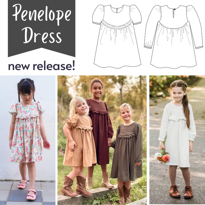 The Penelope Dress is a sweet, vintage-inspired design with a curved bodice and a full gathered skirt. Its blank-front bodice is perfect for adding embroidery or appliqués, and the pattern includes fun details like an optional front ruffle and handy inseam pockets. A single button at the back closes the dress, completing the classic look. It’s a charming choice for fall and a great way to showcase cozy woven fabrics.