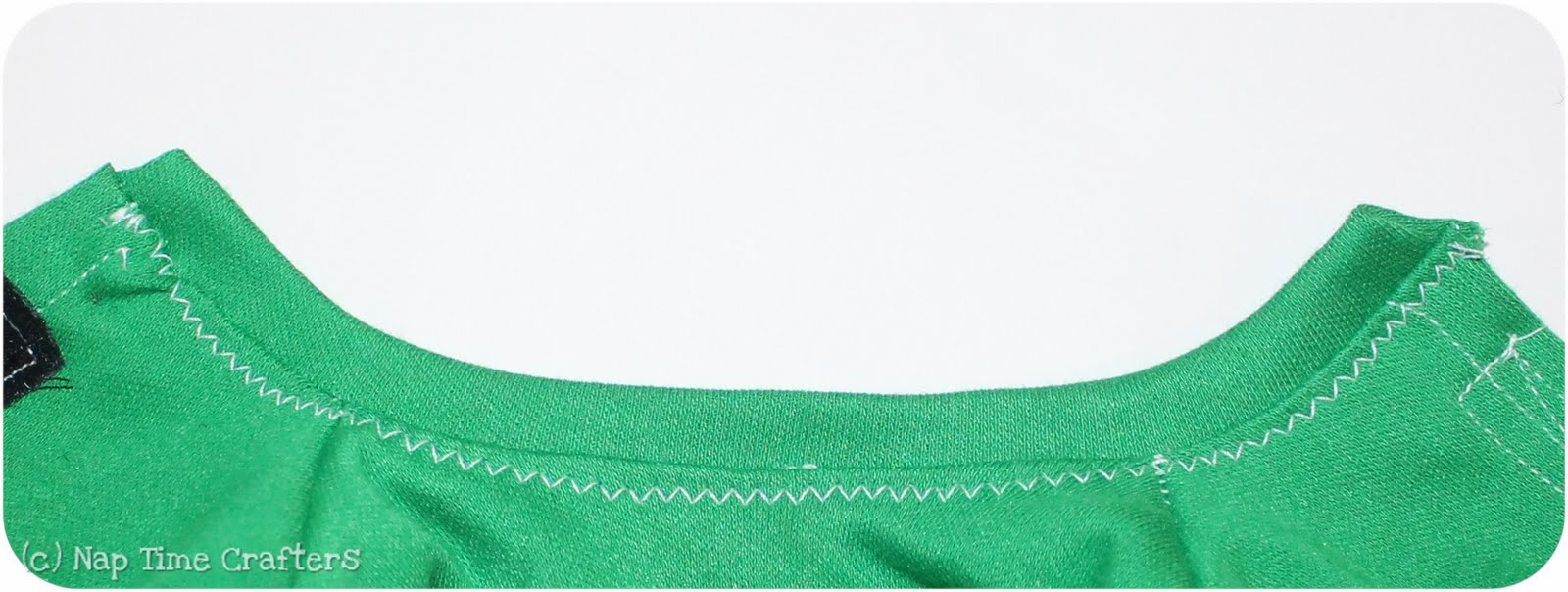 Step 7. With RST sew up the 2 short sides of the neck binding. Turn right side out and press flat.