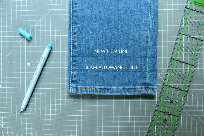 - Fold the leg UP so the original hem's topstitching aligns with the TOP marked line