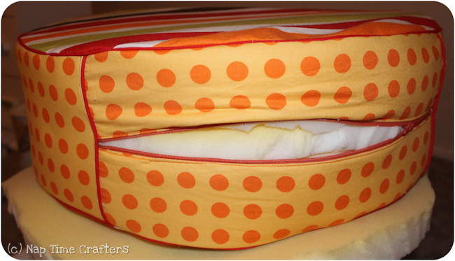 Step 1: Cut out a top and bottom circle with a 20 inch diameter. I cut a string to 10″ and pinned it in the center and taped a pen to the other end to create a make shift compass (remember those???). I then folded it in quarters to make sure everything lined up well and cut them out. If you want to do piping baste that to the outer edge overlapping your 2 ends. I find it’s easiest to use my zipper foot for this step.