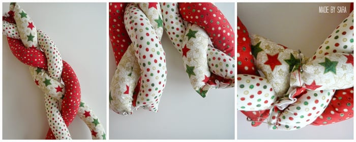 Wreath Step 5: Braid the stuffed wreath tubes together (note: make sure you make it tight). Secure the three ends together with safety-pins.