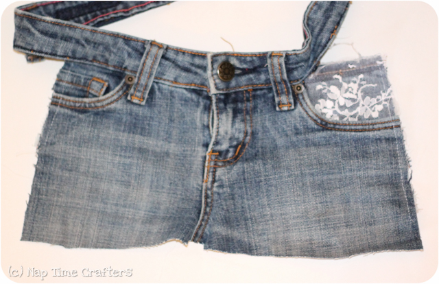 It's my turn to share today and I choose to do a fun up-cycle project with just a touch of lace in one pocket. It adds the perfect amount of girly :) Not to mention up-cycling is so much faster than working from scratch and you get lots of fun details like zippers and rivets.