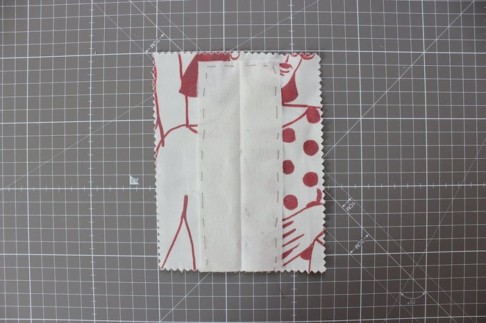 - Fold the side strip edges 3/8 inch on each side and press. Fold the top edge 5/8 inch and press. Secure with pins in place.