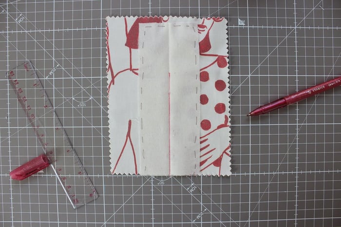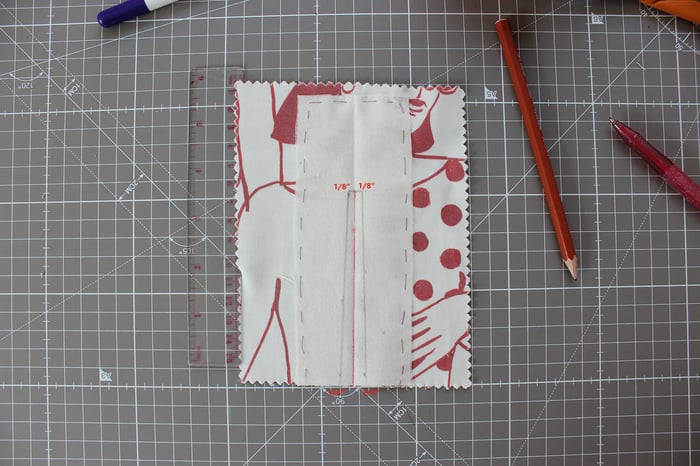 - Use a ruler to draw a 4-inch vertical line in the crease of the fabric strip. Next, mark 1/8 inch on each side of the vertical line, starting at the marked point, and gradually extend 1/4 inch away from the line as you reach the bottom of the line.
