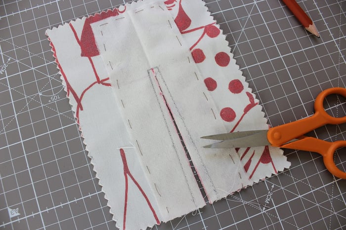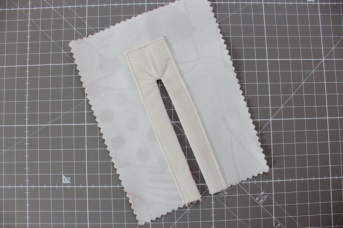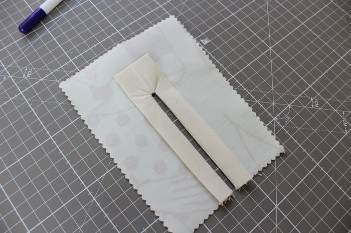 - Line up the middle crease of the fabric strip with the marked slit line on the fabric with right sides together. In addition, make sure that everything is lined up at the bottom, so both the strip and the bottom edge of the fabric are in line.